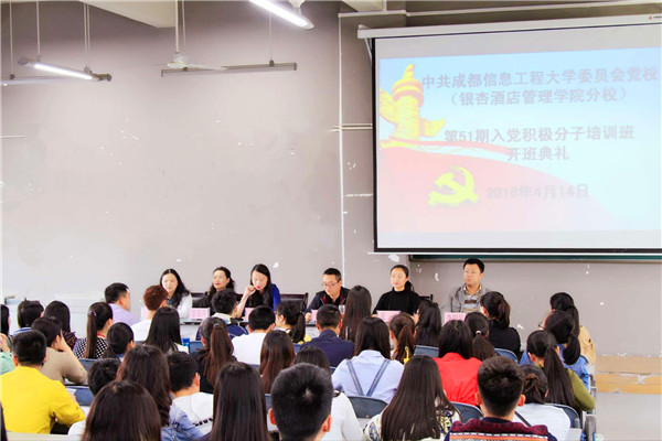 4月14日,中共成都信息工程大学委员会党校(银杏酒店管理学院分校)第51期入党积极分子培训班开班典礼在1330教室如期举行。开班典礼由学院党委副书记兼纪委书记龚燕同志主持,学院党委副书记桑作银同志,党委委员、人事处副处长袁一田同志,党委委员、监察处处长景蜀萍同志,学工部副部长、学生处副处长、团委书记李瑞泉同志,党委工作部副部长马倩同志以及各系党总支书记、总支委员等出席会议。本期党校培训班共有279名新学员参加培训。