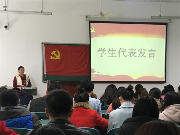 大会最后一项议程为教师代表和学生代表代表发言。李佳芩老师表示,中共十九大会议的召开,吸引了全世界的目光,这是我国综合实力上升,国际地位提高的表现,作为一名高校教师,更应该紧跟党走,提升自身本领为实现中国梦不懈奋斗。杜盼盼老师以新改版党章为切入点,阐述了自己对党章新内容的理解并提出希望:中国梦不是高高在上的,她与我们每个人息息相关,外语系的学子该明确自己的角色意识,对外交流应时刻提醒自己作为一名中华文化传播者的责任。 邓桦老师的发言则将着眼点放在了我党对教育事业的政策上,她表示党的十九大明确说明要优先发展教育事业,作为一名教育工作者,倍感责任重大,日常工作中必须把教育事业放在优先位置,强化责任意识。