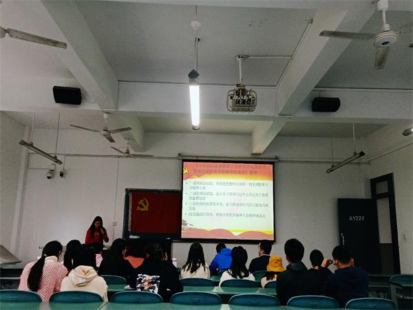 2018年11月6日中午,外语系党总支学生党支部在1222教室组织开展了10月党员党日活动。外语系全体学生党员及学生第一党支部书记朱玲同志参加了此次学习活动,本次活动由学生第二党支部组织委员何雅雯同志主持。