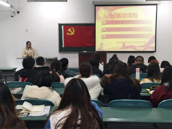 2018年12月4日中午,酒店管理系党总支学生党支部在2112教室举行党员活动。酒店管理系党总支学生党支部书记胡月泓、学生支部全体党员参加此次活动。