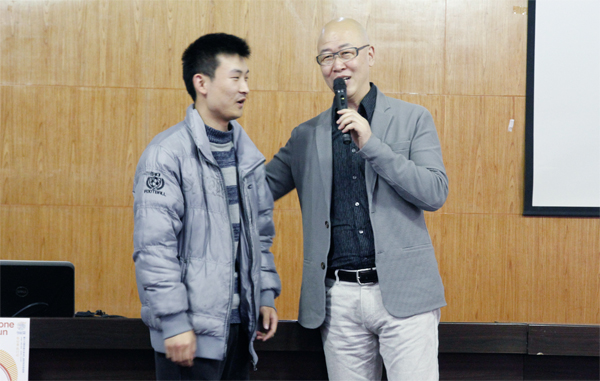 东方船(中国)传播机构CEO王郁斌(右)对广告创意侃侃而谈,并与同学现场互动