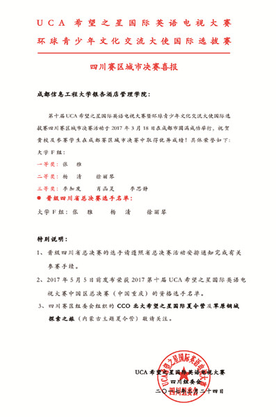 第十届UCA希望之星国际英语电视大赛暨环球青少年文化交流大使国际选拔赛四川赛区城市决赛活动于2017年3月18日在成都市圆满成功举行。近日,组委会向我院发来喜报,学院外语系学生张雅、杨清,酒店管理系学生徐丽琴三位同学,在此次决赛中均取得优异成绩,顺利晋级四川省总决赛。