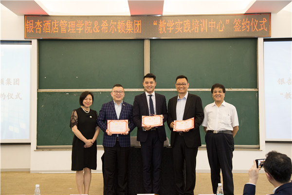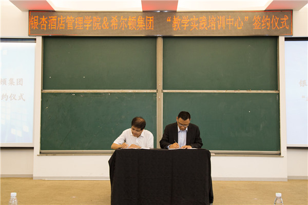 2018年6月19日,成都信息工程大学银杏酒店管理学院与希尔顿集团教学实践培训中心签约仪式在学院报告厅隆重举行,希尔顿亚太区院校合作总监秦智强先生,希尔顿大中华区及蒙古院校合作高级经理刘雷先生、成都协信希尔顿酒店总经理贺劼先生、成都希尔顿旗下各酒店人力资源总监以及成都信息工程大学银杏酒店管理学院院长许仁忠先生、副院长刘丹女士、党总支书记兼办公室主任李俊杰先生、系主任助理徐君宜女士、酒店系教师和学生共同出席。