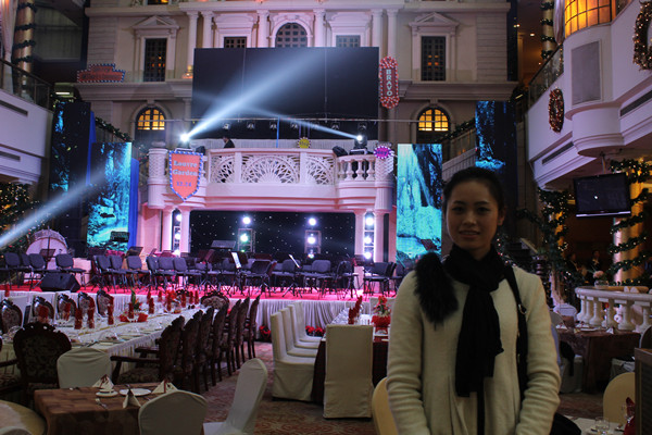 此次演出由学院合唱团指导教师陈浩老师亲自带队,共70名同学参加。同学们于当天下午2:30抵达锦江宾馆著名的法式宴会会厅“卢浮花园”。经过一系列紧张的彩排与准备之后,晚会于晚7点正式开始,宴会厅内的宾客多达八百于人。演出伊始,我院合唱团分别演唱了《欢乐颂》、《雪绒花》、《we wish you are merry christmas》等7首歌曲,凭借精湛的歌唱表演实力,同学们受到了在场来宾与工作人员的一致好评。
