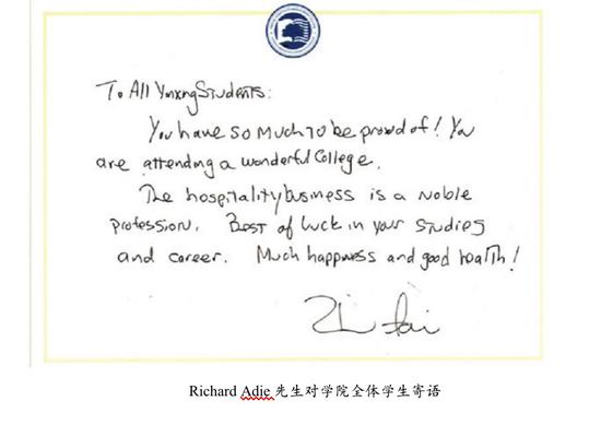 2019年9月30日上午,为美国康奈尔大学Statler酒店效力18年的前总经理Richard Adie先生访问学院,来到了主要由学生参与运营的Simple Café咖啡馆,对品尝到的咖啡赞不绝口,并亲笔写下了对全体学生的寄语: