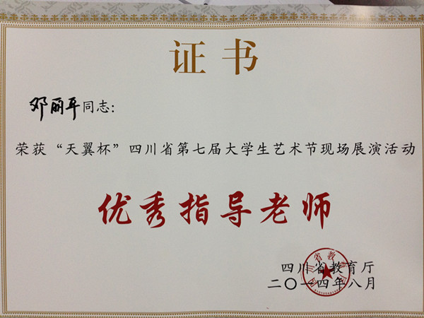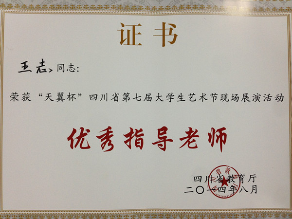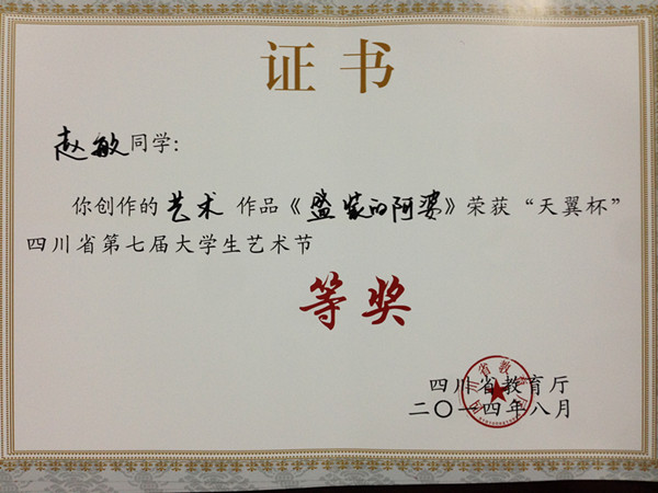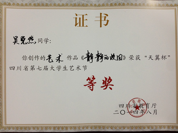 我院学生作品在四川省教育厅举办的“天翼杯”四川省第七届大学生艺术节中收获颇丰,获得了三银六铜的好成绩。其中院合唱团选送的《在灿烂的阳光下》获得声乐类作品铜奖;杨雄锋的《柔软时光》、王丽的《青春的脸旁》和龙颖的《闲淡的时光》等三幅作品获得大赛美术作品类银奖;林薇的《石榴熟了》、赵敏的《盛装的阿婆》、吴晓然的《静静的故园》、薛慧婧的《梦想远航》以及赵旌晶的《青春等待》等五幅作品获得大赛美术作品类铜奖。陈浩、周黎明、焦海龙、邓丽平、王志等老师获得了大赛优秀指导老师荣誉称号。