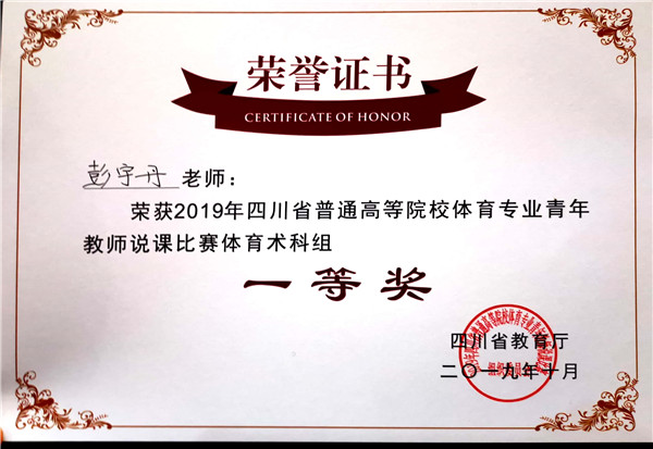 2019年10月24日,由四川省教育厅主办,四川师范大学承办的2019年四川省普通高等院校体育专业青年教师说课比赛在四川师范大学(成龙校区)圆满落幕。我院教师彭宇丹、杨红芬、刘月簇老师从全省34所高校近100名参赛教师中脱颖而出,分别获得体育术科组一等奖,公共体育组一等奖和体育理论组二等奖,学院荣获本次比赛团体一等奖。