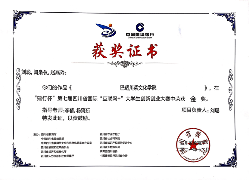 我校学子在本次大赛中斩获佳绩,共获得1金2银11铜,共计14个奖项。来自外语系的刘聪、闫枭仪、赵燕玲三位同学的作品《巴适川菜文化学院》荣获金奖,指导老师李倩、杨猗茹获得“优秀指导教师奖”。来自信管系的刘旭昌、卢小凤等六位同学的作品《微科智分-垃圾分类解决方案》与来自艺术设计系的陈丹丹、廖丽敏等五位同学的作品《赤华潮衣工作室》分获银奖。