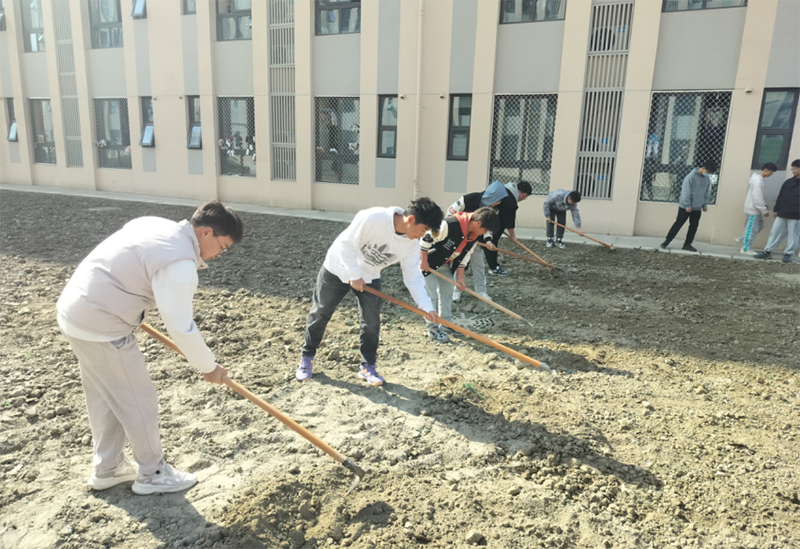 在各班老师策划、带领下,学生们便开始在各班级“承包田”进行劳动实践,他们在种植区清除杂草、翻松土地,捡净杂物,种下菜苗,浇水灌溉。