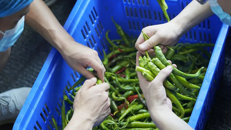 刚从劳动实践基地摘回来的青椒,趁着新鲜,摘叶、清洗,再请学校食堂帮忙加工,青椒酱走起!