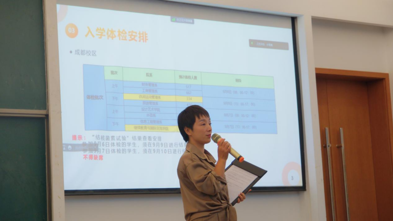 王铃介绍本学期新生入学体检及学生医保工作的具体安排,重点提到双校区校医务室运行改革,以及介绍成都校区即将运营的四川省内高校首家24小时无人数智药房的各项功能。