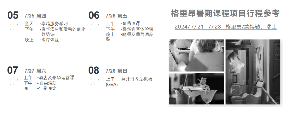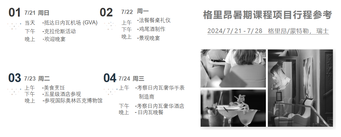 Glion1962年建校, 一直致力于教授奢华酒店业及相关领域服务与管理。本次项目专为全球18-26岁青少年设计的奢华酒店主题课程,通过一周精彩地沉浸式体验,深入学习卓越服务与酒店运营方面的大师课、烹饪和美酒佳酿品鉴活动、鸡尾酒调酒术学习。