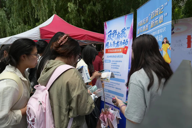 活动分为两个环节,第一个环节以发放宣传知识册、引导学生关注中国反邪教网、摆放宣传展板、签署拒绝邪教承诺书等形式开展。