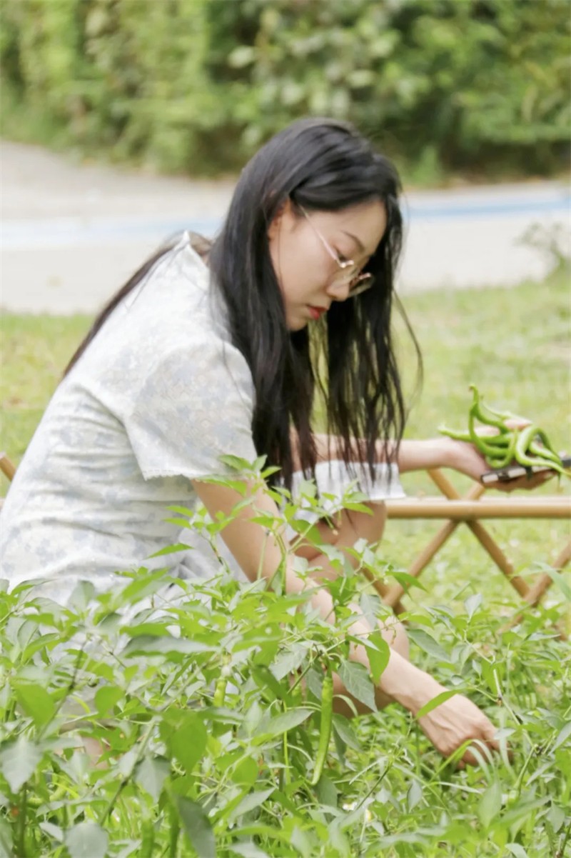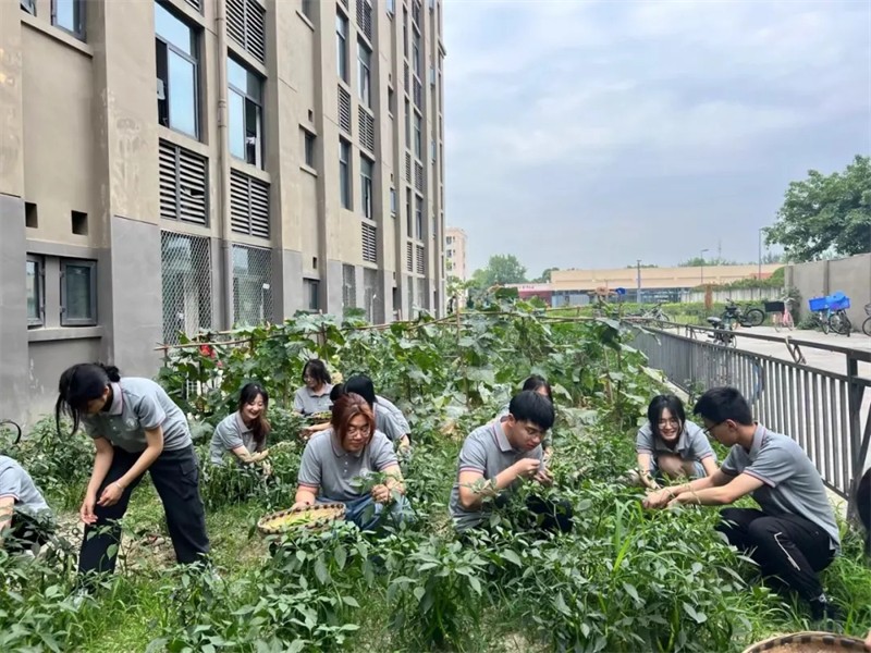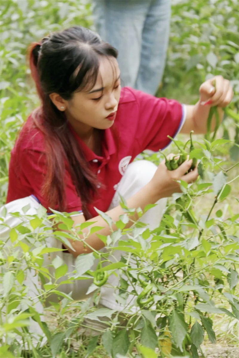 师生拿着小竹筐,小心翼翼地把辣椒摘下来放进筐里。一边认真采摘,一边拍照留念,用镜头记录下采摘的乐趣和收获的喜悦。