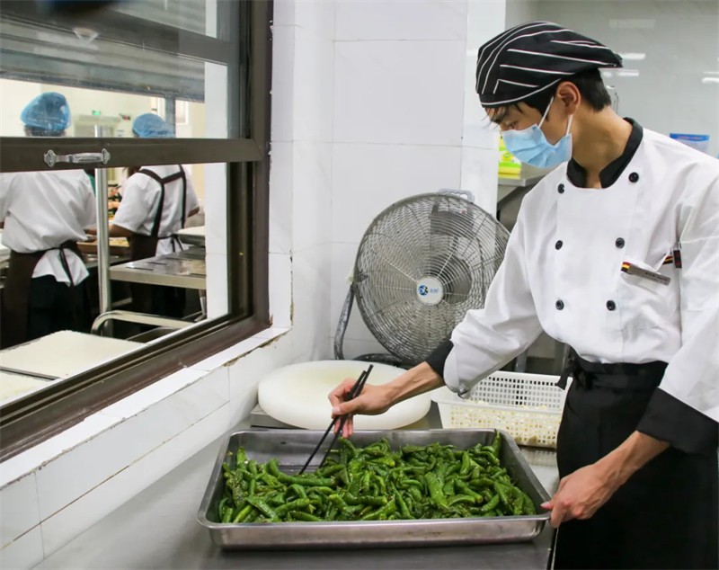 洗、切、炒,同学们戴上厨师帽和口罩,认真聆听制作烧椒酱的流程。