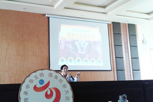 2015年10月14日下午,四川省创意文化产业协会专家、国家级教授、旅游管理系客座教授陈红涛在1122学术报告厅为我系学生开展了题为“您身边的财富·旅游文化话天府”的讲座。讲座由学院副院长兼教务处处长陈进忠教授主持。